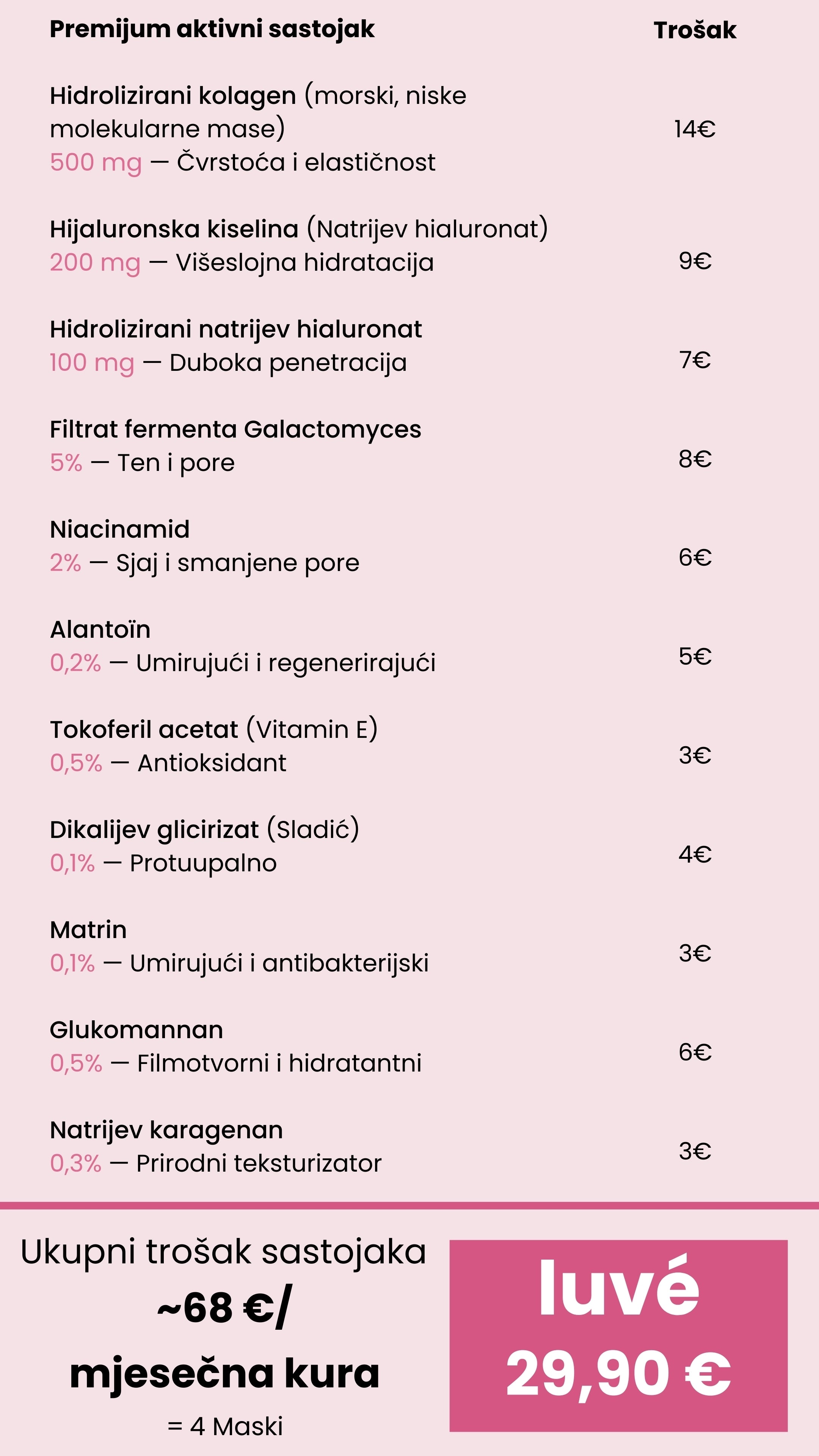 Sve. Koristimo 3 puta više kolagena, dizajn u dva dijela po mjeri i mješavinu peptida i hidratacijskih kompleksa niske molekularne mase za vidljive rezultate — brzo. Bez ljepljivosti, bez trikova. Samo pravi sjaj.
